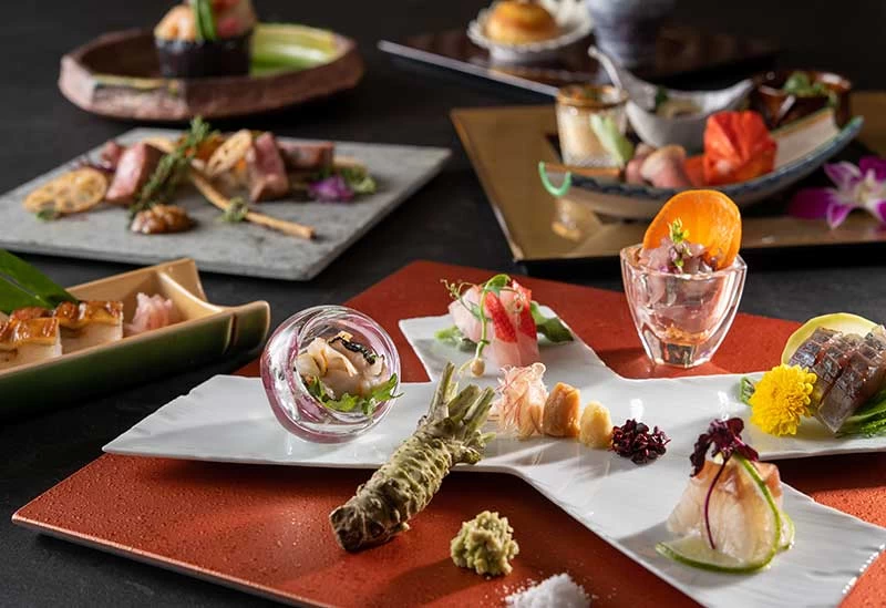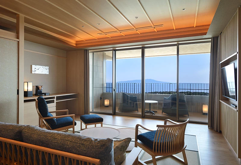 伊豆高原の高台に立つ「亀の井ホテル 伊豆高原」は、全客室が相模灘と伊豆諸島を一望できるオーシャンビューの宿です。広々とした客室には、温泉露天風呂付きの「プレミアムスイートルーム」もあり、絶景を眺めながら贅沢な湯浴みを満喫できるのが魅力。円形露天風呂を備えた大浴場では、満天の星や朝焼けの海を眺めることができます。湯上がりに立ち寄りたいのが、海までつながっているかのように見える「水盤テラス」。移ろいゆく景色とともに、リゾート感あふれる特別なひと時を過ごせます。最上階のレストランで旬の食材を使った彩り豊かな創作和食会席を絶景とともに堪能すれば、心もおなかも満たされること間違いなし。