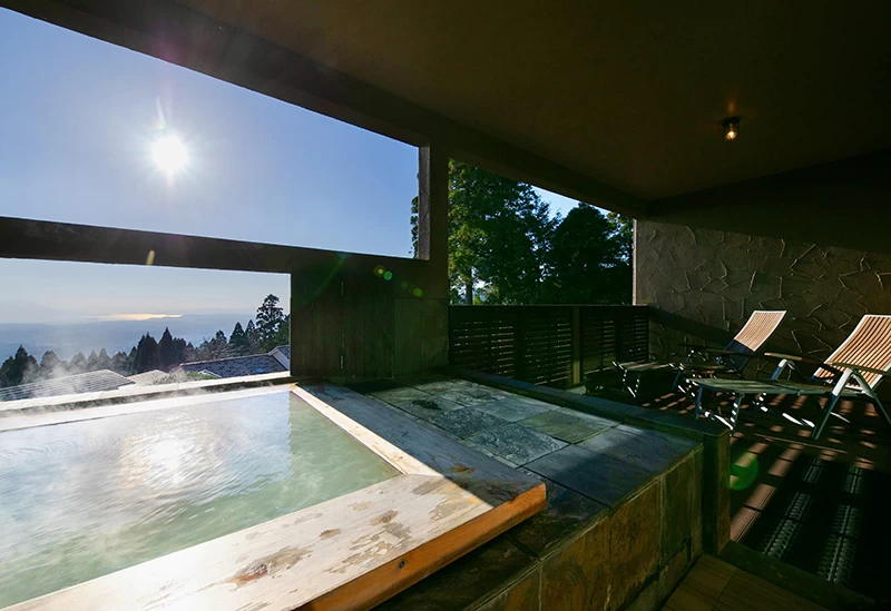 ノスタルジックなヨーロッパの田舎町を思わせる佇まいが印象的な「天からの贈り物 VillaMontpetre」。棟ごとに趣が異なる全5棟の客室が用意されており、滞在スタイルに合わせて選べるのが魅力です。専用サウナと特別ダイニングを備えた「エデン」をはじめ、各棟では霧島の美しい景色を望みながら露天風呂を楽しめます。食事は黒毛和牛や農薬を控えて育てた野菜を使った創作フレンチを個室でゆったり味わえるのも嬉しいポイント。車で約5分の「霧島神宮」をはじめ、周辺観光地へのアクセスも良好です。