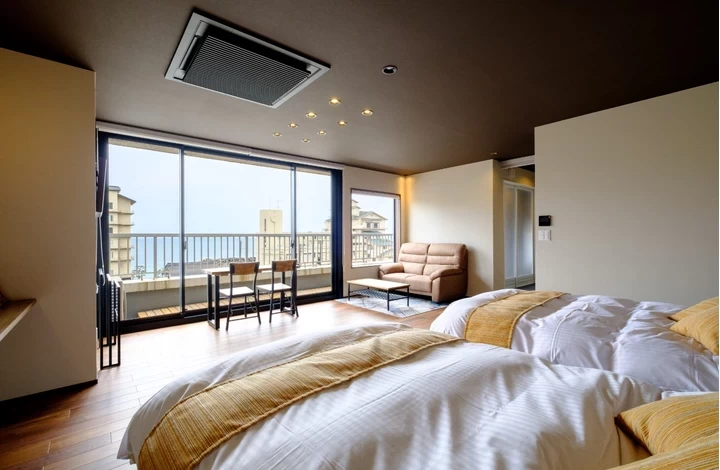 日本海・美保湾のパノラマが広がる海辺に立つ全室オーシャンビューの湯宿。海景色が楽しめる露天風呂や大浴場は、皆生温泉を源泉掛け流しで提供しています。気兼ねなく湯浴みを楽しみたいなら、貸切露天風呂や家族風呂もおすすめです。客室は、窓一面に広がる海景色が格別な西館ツインが最高ですよ。