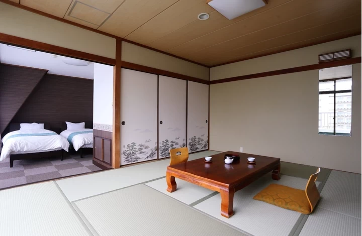 畳の上で愛犬と寛いだり、布団で一緒に寝たりと、わんちゃんとの旅行が思う存分に満喫できる皆生温泉の和風旅館。スタンダードな和室のほか、展望風呂付きの客室から和洋室まで多彩な部屋タイプが用意されています。