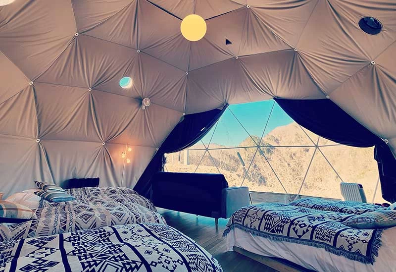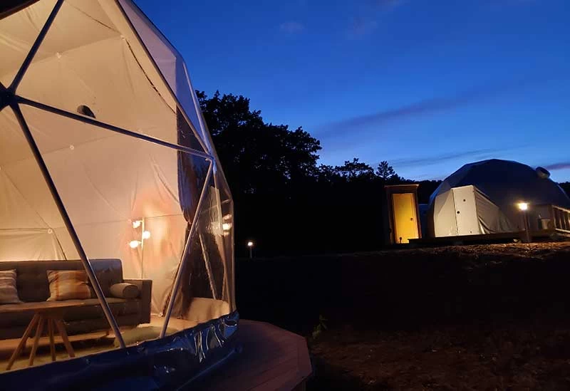 大きな窓を備えたドーム型テントを採用し、冷暖房も完備。快適な空間にいながら、自然の息づかいを身近に感じられます。時間とともに移ろう景色を眺められるのもうれしい魅力。夜には、闇に浮かぶテントの灯りや満天の星々が、非日常のひと時を演出してくれます。