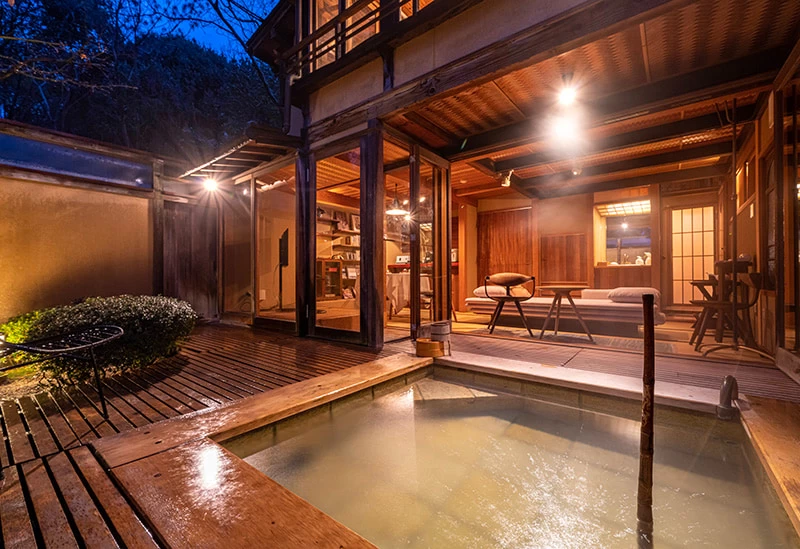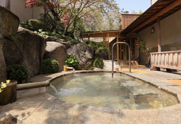 檜の内湯と空に開かれた露天風呂がある大浴場では、背後の山から引いた温泉を楽しめます。白木と土壁に囲まれた、ゆったりとした貸切風呂も。夕食は瀬戸の幸と山の恵みをふんだんに盛り込んだこだわりの料理を提供しており、なかでも「アナゴの釜炊き御飯」は絶品です。