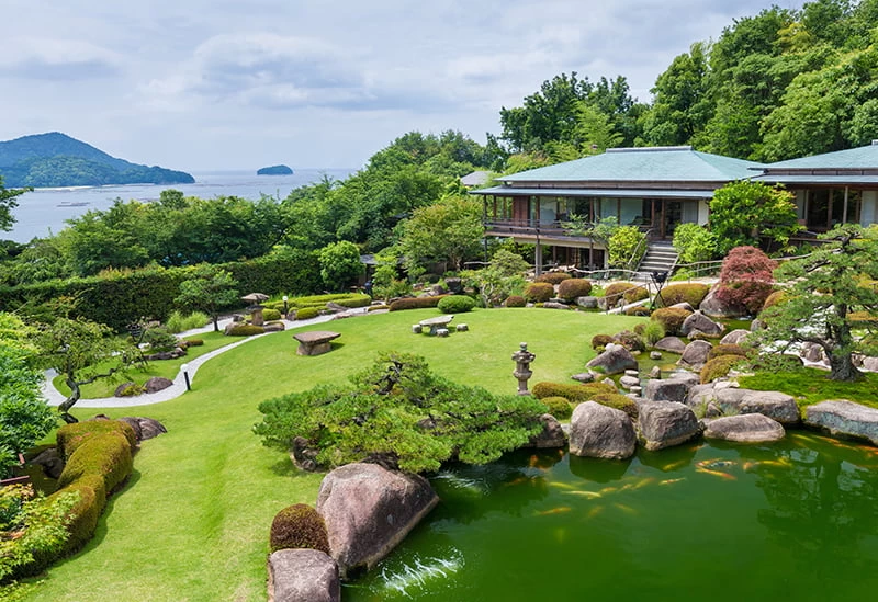 宮島と瀬戸を望む閑静な1,500坪の庭園に佇む「庭園の宿 石亭」は、優雅なひとときを過ごせる離れ座敷の宿。美しい和風庭園には母屋・離れ・四阿があり、個性豊かな12室の客室が配されています。