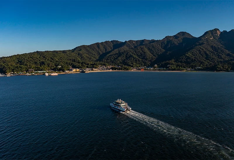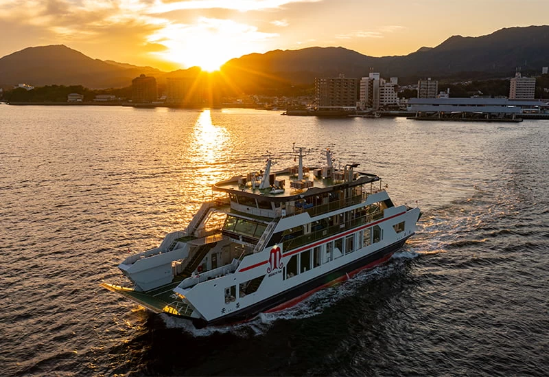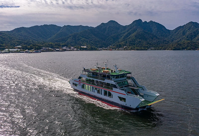 「安芸の宮島」と対岸の宮島口を結ぶ航路を運航する「宮島松大汽船」。約10分と短時間で到着するため、時間を有効活用したいときにおすすめです。世界遺産の嚴島神社の大鳥居や島全体を海上から眺めることができ、快適な船旅を楽しめますよ。