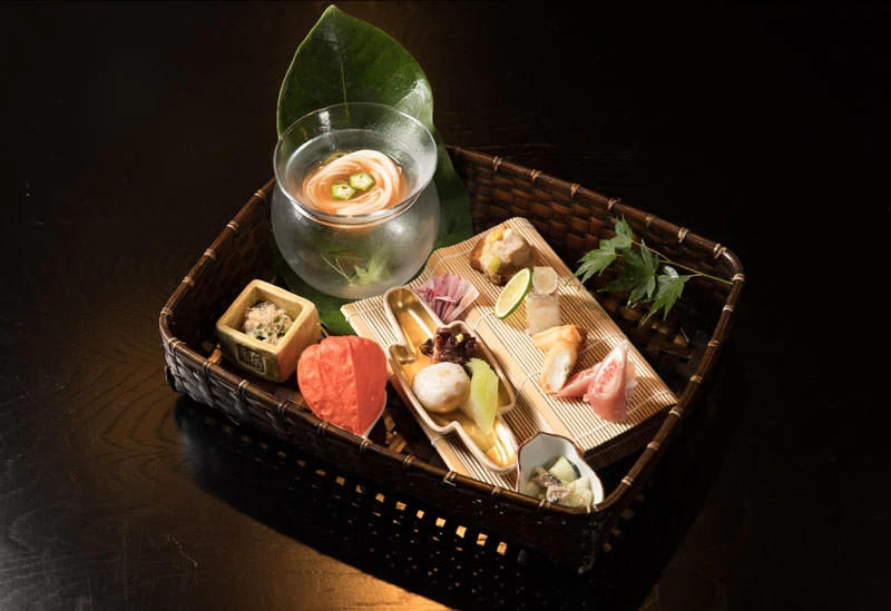 若い板長が腕を振るう、月ごとに変わる旬の懐石料理には、地元食材を中心とした海の幸・山の幸を使用。その味はもちろん、オーナー自らが全国から買い集めた器も魅力です。