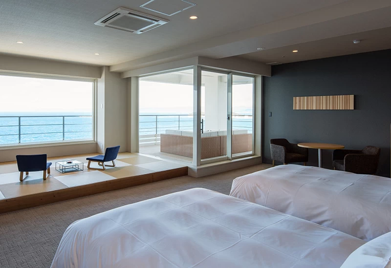 宿泊者を迎えるヴィラは4タイプに分かれており、どの部屋もモダンで洗練された空間が広がっています。特に「2人部屋(ツイン)」と「3人部屋(トリプル)」は、カップルや女子旅でのご利用にぴったりです。また、室内で白浜温泉を楽しむことができます。『日本書紀』にも記される由緒ある温泉で、斉明天皇や中大兄皇子が入湯した歴史があり、平安時代には多くの天皇や貴族が癒やしを求めて訪れたとされています。白浜温泉の高い保湿効果や美肌効果に癒やされてみてはいかがでしょうか。