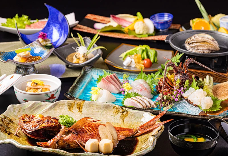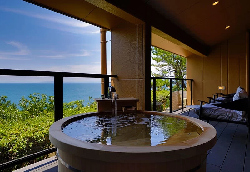 貸切の展望露天風呂が自慢の老舗旅館です。全客室が海向きで、相模湾の雄大な景色を一望できます。自然の美しさを感じながら、心ゆくまで寛げる贅沢なひと時を過ごせるでしょう。また、温泉はすべて源泉掛け流し。湯処や客室風呂で湯の恵みを存分に堪能できます。さらに事前に相談すれば、記念日やお祝いの際には、ケーキや花束などの演出もサポート。特別な1日を、より華やかにしてくれます。