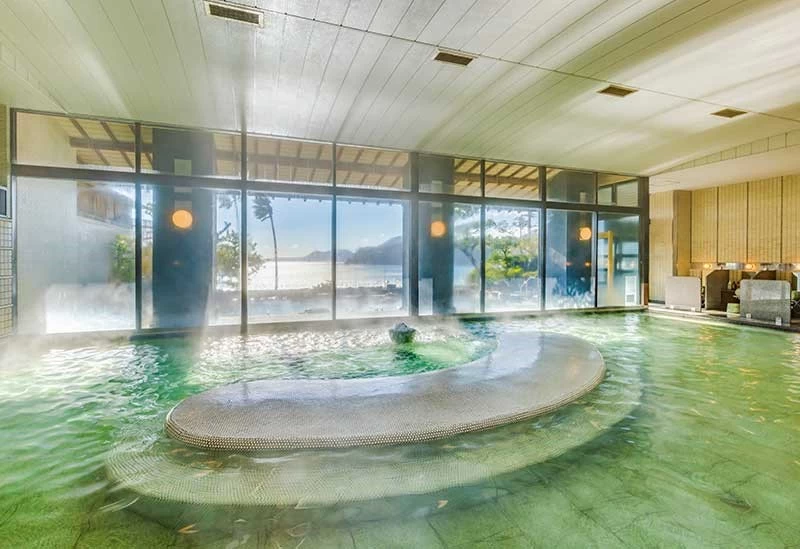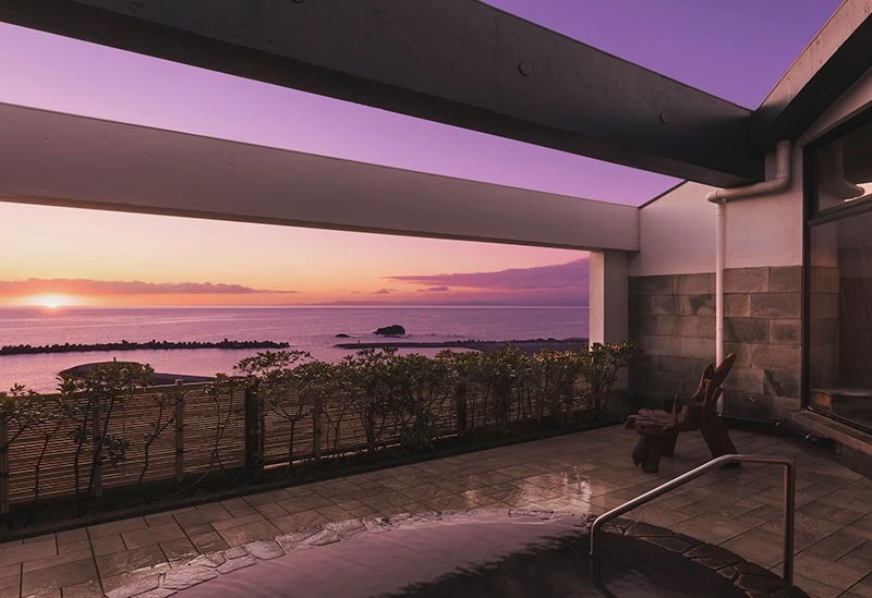 海風と波音が心地よい和風温泉旅館です。展望露天風呂と大浴場には、自家源泉がなみなみと注がれ、海景色を楽しみながら湯浴みができます。温泉は弱アルカリ性の塩化物泉で、保温効果抜群! 体を芯から温められるでしょう。また、料理長が腕をふるう会席料理には、金目鯛や旬の海の幸が揃い、洗練された器とともに提供されます。年齢に合わせたお子さん料理もあり、子連れのご家族でも気兼ねなく過ごせますよ。