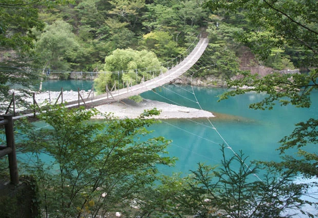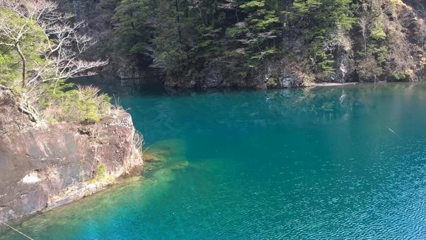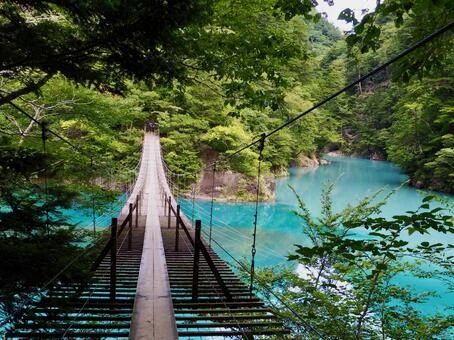 寸又峡温泉に立ち寄ったら、ぜひ訪れてほしい絶景スポット「夢の吊り橋」。寸又峡温泉から徒歩20分ほどの場所にある、大間ダム湖の上にかかった約90mの吊り橋です。大間ダム湖の美しい青色の秘密は、その水質。微粒子やプランクトンが少なく水質がきれいに保たれた大間ダム湖では、波長の長い赤い光は吸収され、波長の短い青い光だけが反射する「チンダル現象」が見られます。実際の色は差し込む光の加減によって異なり、エメラルドグリーンやコバルトブルーなど、その日の天気によってさまざまな色味を帯びるといわれています。