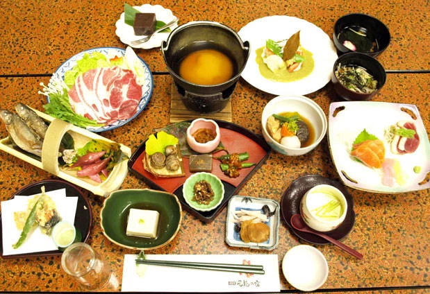夕食には山菜や川魚、猪肉など、地元の恵みを活かした郷土料理が並び、心も体も芯から温まります。