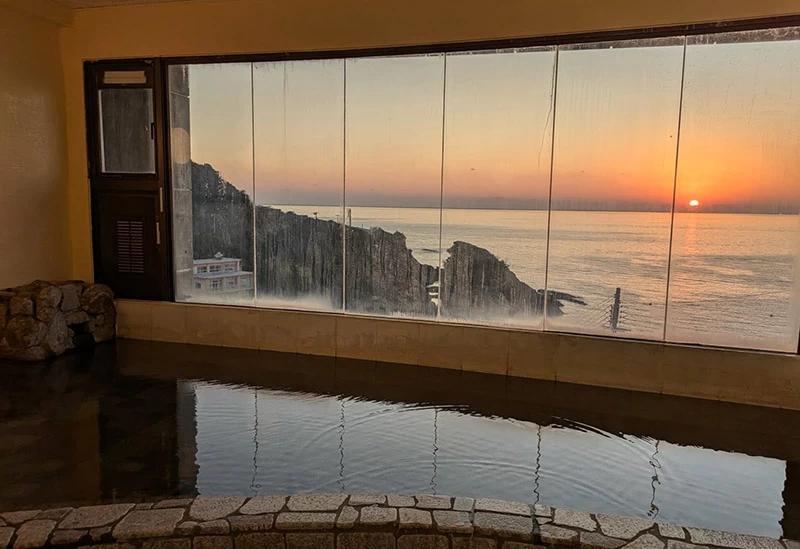 昭和29(1954)年創業の湯治宿で、海抜約60mに位置し、美しい眺望が楽しめることでも知られています。展望風呂からは太平洋を一望でき、夕焼けや漁火が広がる景色の中で、贅沢なひと時を過ごせます。源泉かけ流しの湯は、入浴時間中いつでも新鮮な湯が満たされ、薬草や果実を使った日替わり風呂も好評です。源泉と加温した湯を交互に楽しむことで、温泉効果がより高まります。