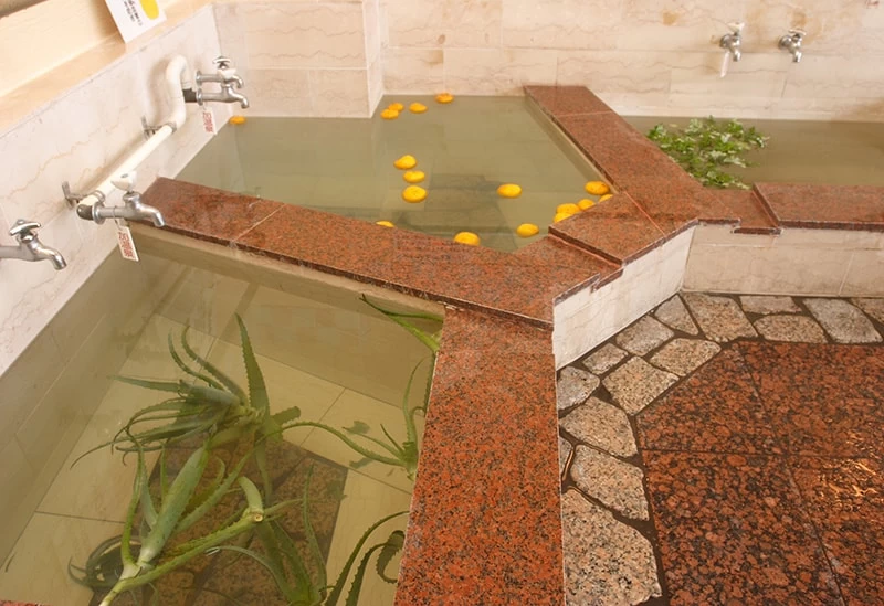 さらに、pH9.9の強アルカリ性であることも大きな特徴。肌の皮脂と反応し、石けんのように古い角質をやさしく落とす作用があるとされ、「美肌の湯」として親しまれています。なお、源泉温度は約31℃と低めですが、加温された湯と交互に入浴することで、体がしっかり温まり、効能も期待できます。