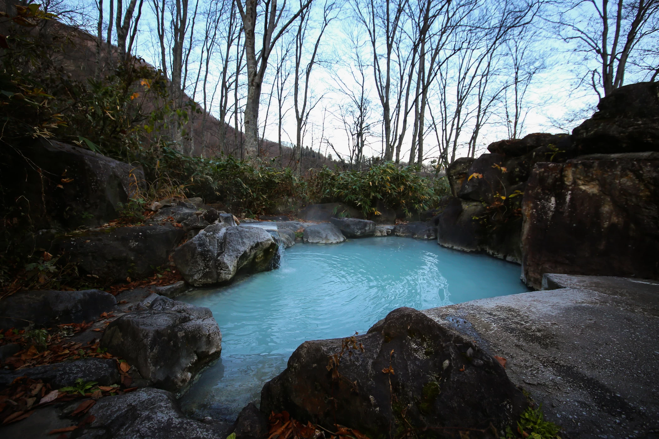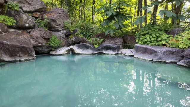 燕温泉の駐車場から徒歩約15分。小さな渓流沿いに佇む野天風呂です。岩や石で組まれた趣ある造りと、開放感あふれる眺望が魅力。水音に耳を傾けながら、ゆったりとした湯浴みを楽しめます。真っ白やラムネ色に見える硫黄泉は、美人の湯としても評判。脱衣所小屋が整備された混浴の温泉です。