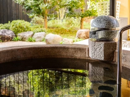 滝が流れる日本庭園を望む「滝の湯」と、壁一面の窓が開閉し露天風呂のような開放感を味わえる「四季の湯」など、お風呂のバリエーションも豊富。有田焼の器に盛られた月替わりの会席料理に加え、直営工場で作る名物「温泉湯豆腐」も絶品です。