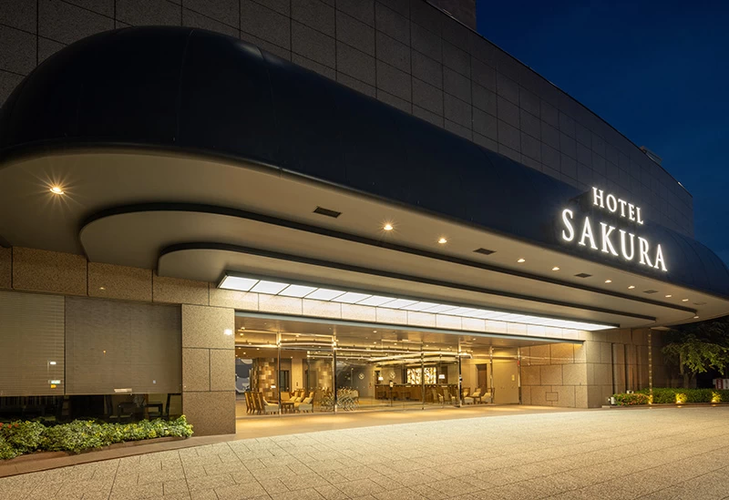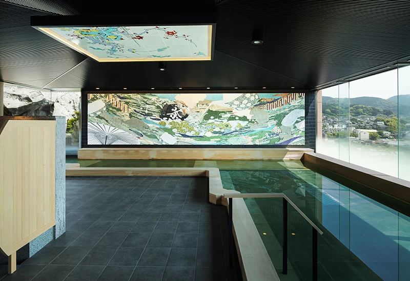 「ホテル桜 嬉野」は、伝統ある温泉街にそびえるモダンな高層ホテルです。最大の魅力は、最上階にある大浴場「茶畑の湯」。内湯の天井や壁一面を彩る有田焼のタイルアートは圧巻で、露天風呂や壺風呂からは嬉野の街並みや山々の絶景を一望できます。