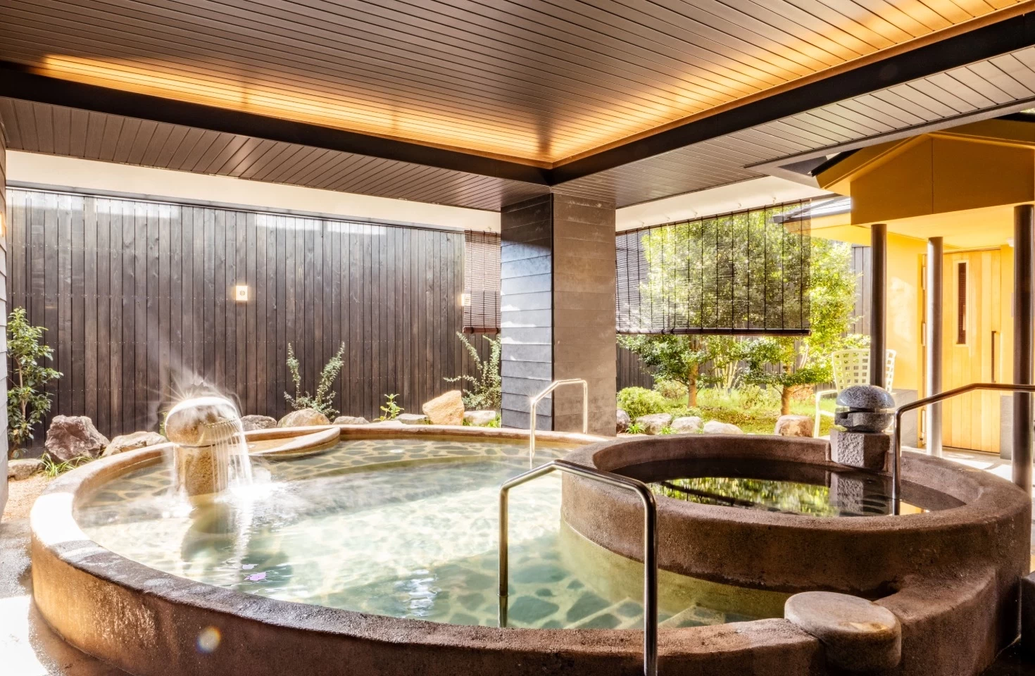 自然源泉から湧き出る、まじり気のない天然温泉の大浴場は、一面のガラスの外に日本庭園を望む大浴場「滝の湯」。壁一面が開閉可能なガラス窓になっており、吹き抜けの高い天井で、露天風呂さながらの開放感を味わえる大浴場「四季の湯」。2つの大浴場で思う存分美肌の湯を楽しめます。
