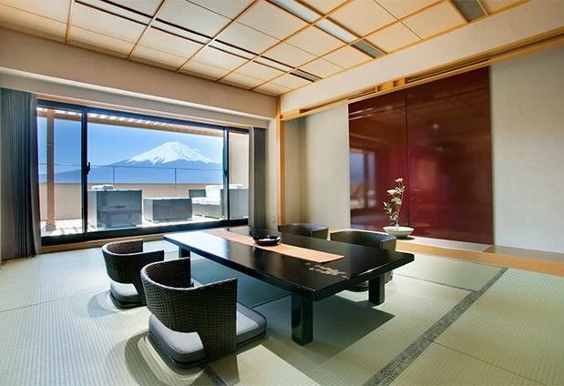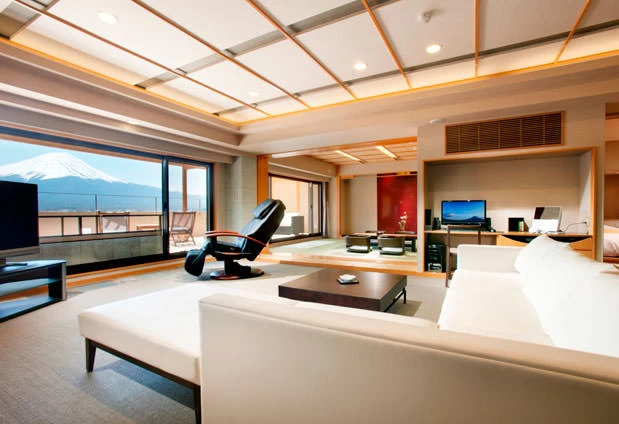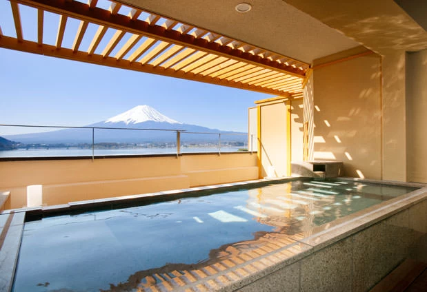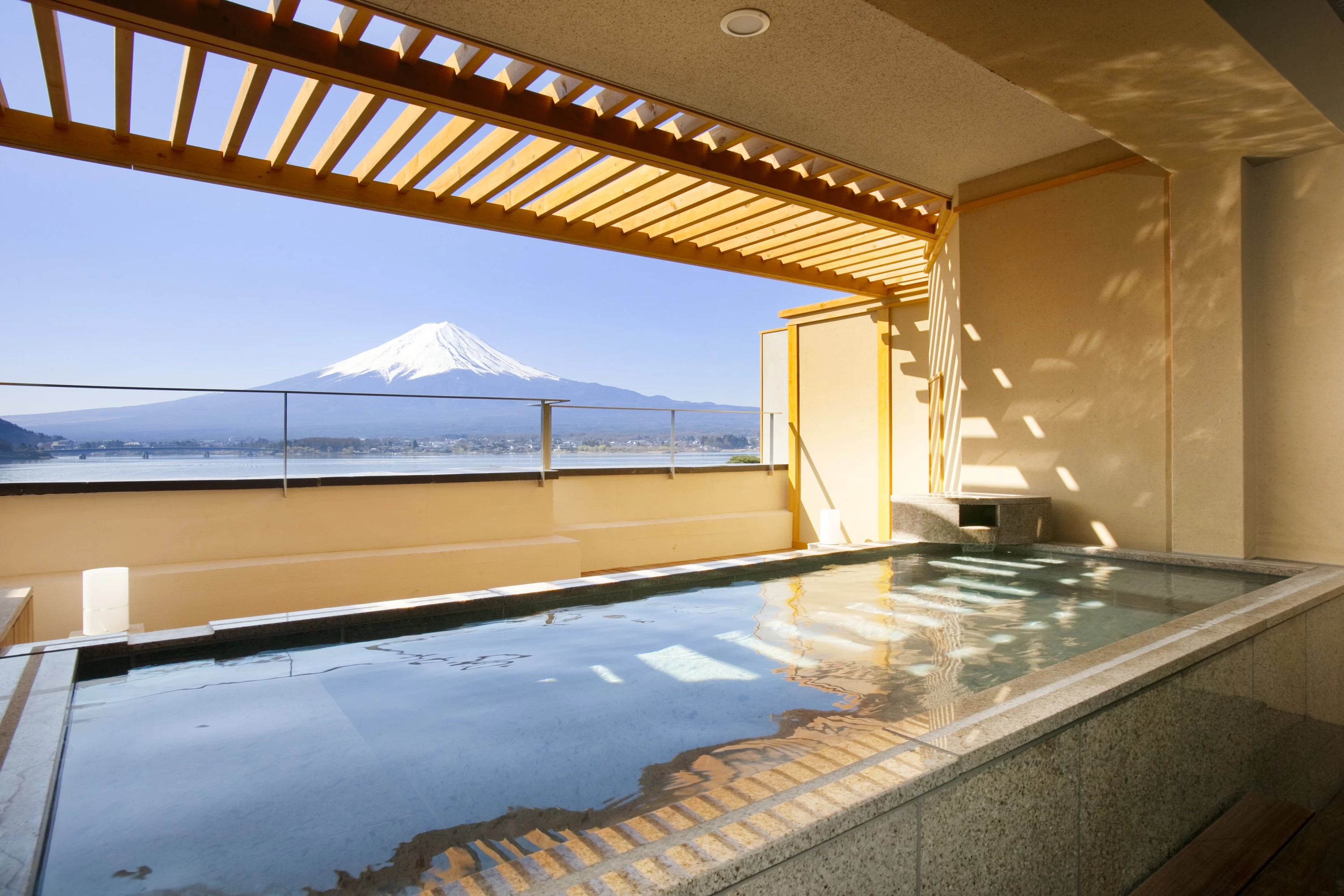 河口湖の北岸のほとりに佇み、絵画のような景色を愉しめる「秀峰閣 湖月」のテーマは、「最上級の“遊”と”寛”を有する宿」。国道から少し離れているため、心地よい静寂に包まれています。客室には露天風呂が付き、富士山の絶景も眺められます。