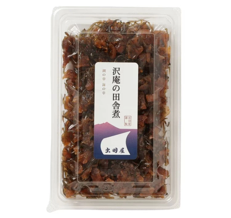 茨城県産の大根を使用した薄切りの沢庵と、北海道産の刻み昆布を一緒に炊き上げた一品。