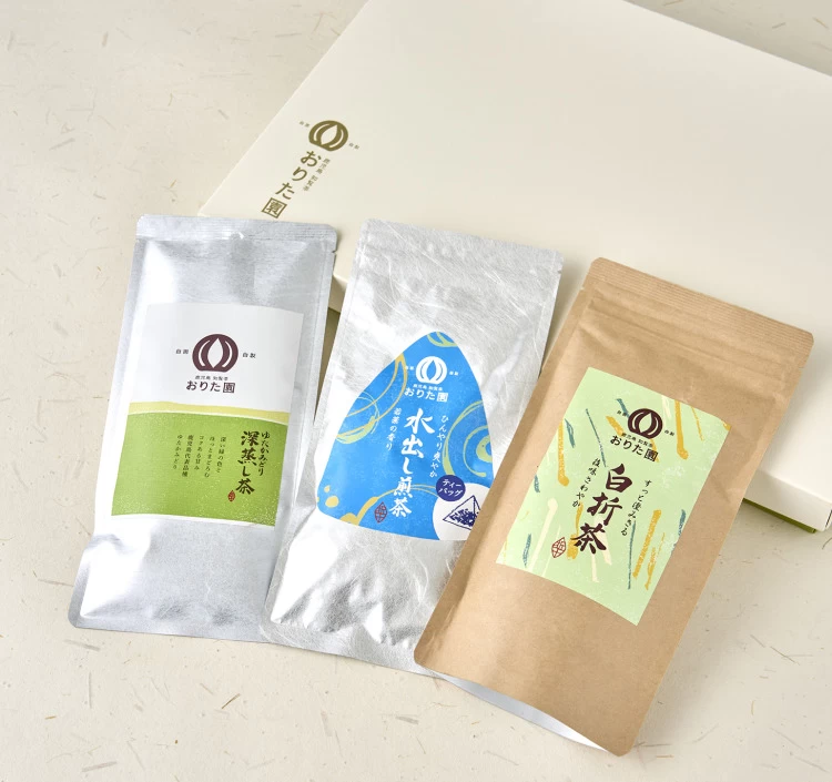 新鮮な味・香りが特徴の水出し煎茶、香ばしい味・香りが特徴の白折茶の3本セットです。