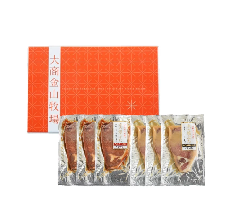 米の娘ぶた、ロース赤ワイン味噌漬け 3枚と大吟醸酒粕味噌漬け3枚がセットになったギフト商品。