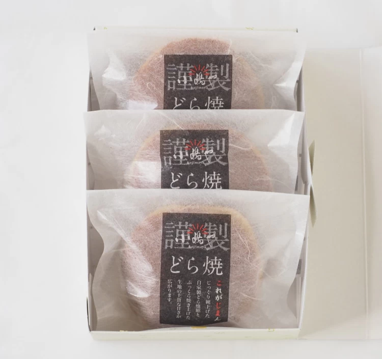 | 内容量 | ①どら焼き3個(1個75g)、②白小豆どら焼き3個(1個75g)、③梅どら焼き3個(1個75g)、④きび糖どら焼き3個(1個75g)、⑤どら焼き1個・白小豆どら焼き1個・梅どら焼き1個 |