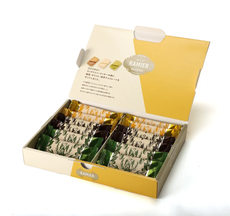 昭和26年、長崎の港町・佐世保で創業した菓子舗「ぽると総本舗」の発売以来、変わらぬ人気を維持している定番商品です。「ラミーエ」は「ラミエル」= キリスト教でいう神に謁見することが許された7大天使の一人、が語源。口どけのよいラングドシャ・クッキーの間に、チョコレートをサンドしました。