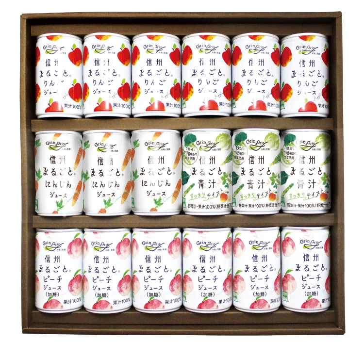 | 内容量 | 信州まるごと りんごジュース・信州まるごと ピーチジュース(加糖) 各160g×6、信州まるごと にんじんジュース・信州まるごと 青汁 すっきりテイスト 各160g×3 |