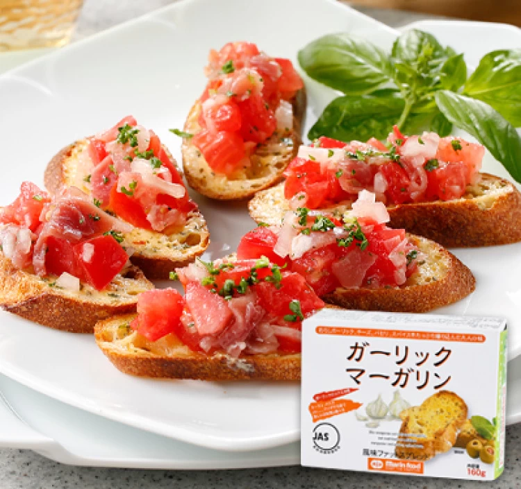 ・ソフトタイプのマーガリンにおろしガーリック、チーズ、パセリなどのスパイスをブレンドした商品