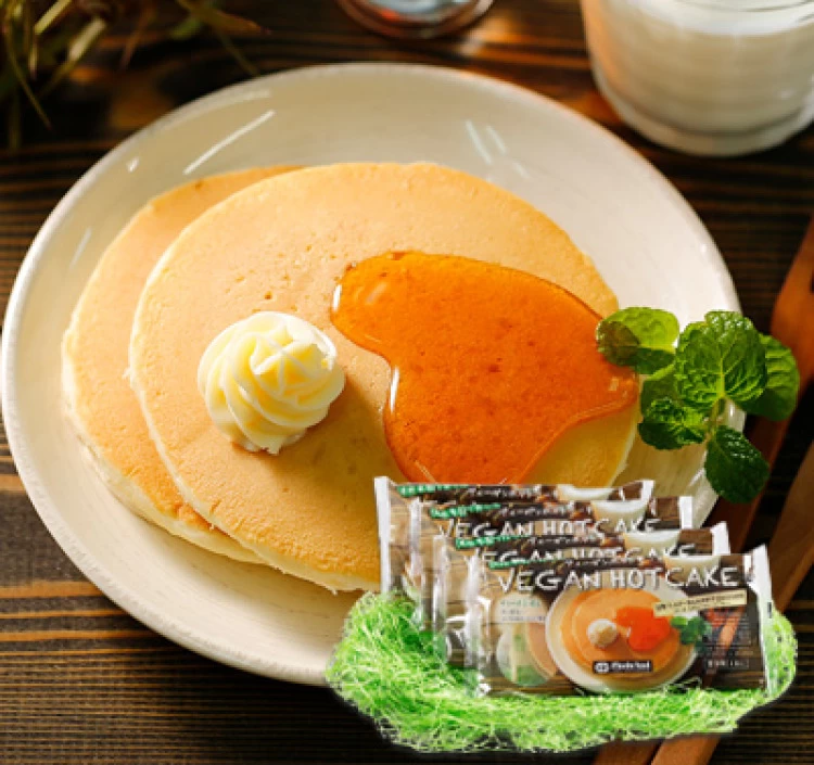 小麦粉、牛乳、卵不使用のホットケーキ。ヴィーガンにも対応しています。米粉を使用しており、もっちりとした食感です。