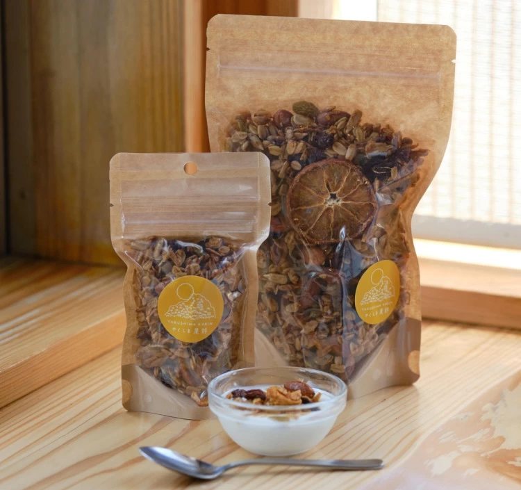 オートミールやナッツ類、ドライフルーツを合わせて八種類を使った「やくしま果鈴」特製のグラノーラ。