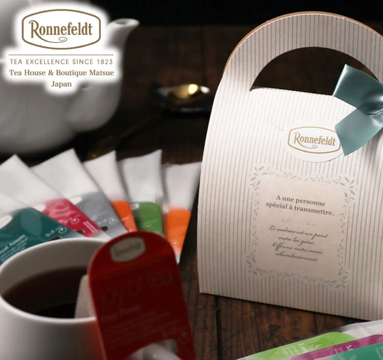 全国に数少ないロンネフェルト認定店「紅茶専門店ロンネフェルト松江」のかわいいバッグの形の箱に入ったセット。中には200ccのお湯でたっぷりお飲みいただけるマグカップ専用ティーバッグ、ジョイオブティーが全12種類が1袋ずつ入っています。少し変わった形の細長いティーバッグの中には、フルリーフの大きな茶葉や新鮮なハーブが入っているため、リーフから淹れたティーと変わらないおいしさがお楽しみいただけます。