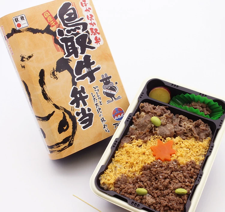 「ほかほか駅弁島根牛弁当」は、やわらかく煮込んだ島根牛をふんだんに使用しています。牛肉は程良い甘みのある特製ダレで煮込んであり、うま煮とそぼろの2種類の牛肉を楽しむことができます。ご飯は山椒飯になっており、さっぱりとした味わいです。付け合わせに薩摩芋の甘露煮があるのも特徴。そのほかにも、弁当箱に付いている紐を引くことで、その場でお弁当を温められるのも嬉しいポイントです。