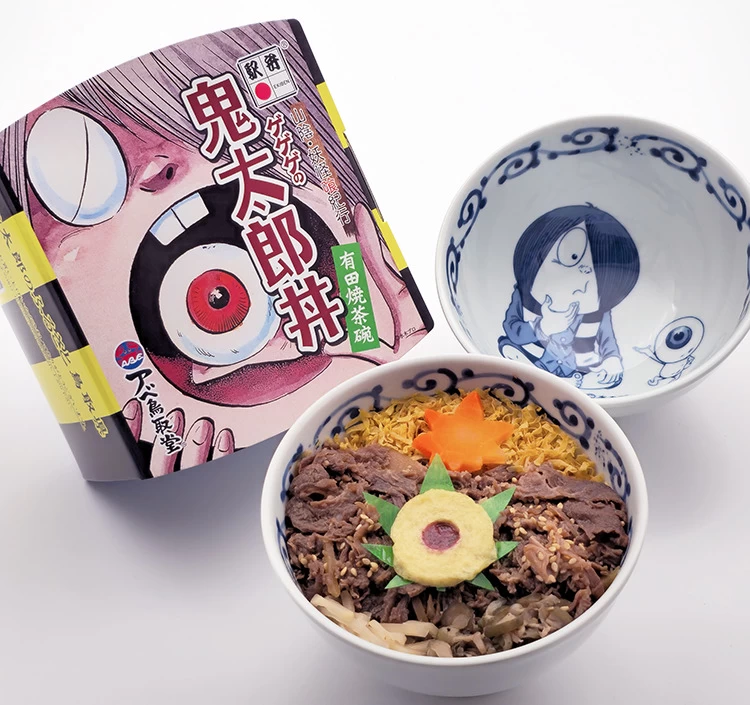 アベ鳥取堂が、鬼太郎のふるさとである鳥取県にちなんで作った駅弁です。豆腐竹輪に練り梅を添えた「目玉おやじ」が印象的です。使用されている鳥取牛は時雨煮風に生姜で煮込まれており、やわらかくしっかりとした味を楽しめます。さらに、容器には有田焼を使用して、妖怪茶碗にしてあるのが特徴。食べ進めるにつれて妖怪たちが現れるので、わくわく感を味わえます。