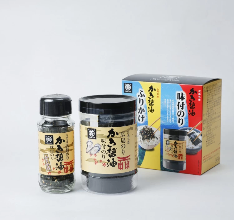 広島牡蠣の濃厚な旨味と風味、ふわっとやさしい食感と口どけの良さが人気のマルヒャクの看板商品「かき醤油味付のり」と、かき醤油味付のりと風味豊かな胡麻を絶妙のバランスで配合した人気の「かき醤油味付のりふりかけ」のセットです。