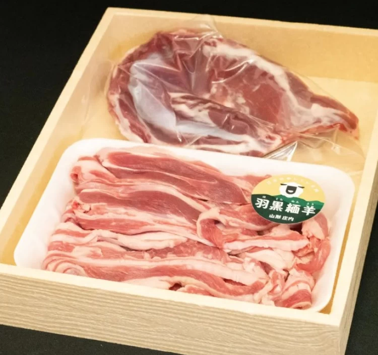 古くから信仰の対象とされてきた出羽三山の羽黒山の麓で、だだちゃ豆の鞘をエサに育てられた羽黒緬羊です。年間を通して限られた数量しか出荷されず、その中でも希少部位とされるヒレ肉を厳選。焼肉用スライス肉300gとセットで食べられます。