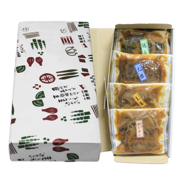 送料無料の味噌漬け4種(大根、生姜、胡瓜、ヤーコン)を1袋ずつ詰合せた合計4袋のセット。