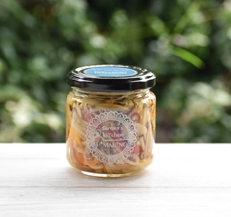 愛媛県内子産の新鮮なゴボウと椎茸、色鮮やかなパプリカを混ぜ合わせ、特製和風マリネ液で漬け込み。