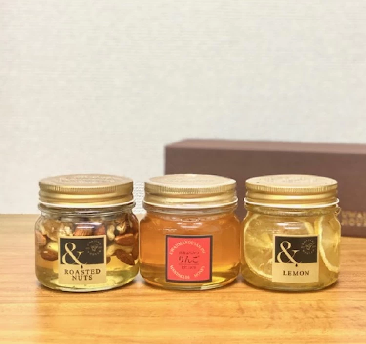 青森県産のりんご蜜は開花10日ほどの希少なはちみつで、フルーティーな味わい。ナッツ漬けはチーズやクラッカーと一緒に、ハニーレモンはドリンクにしても美味しく味わえる。