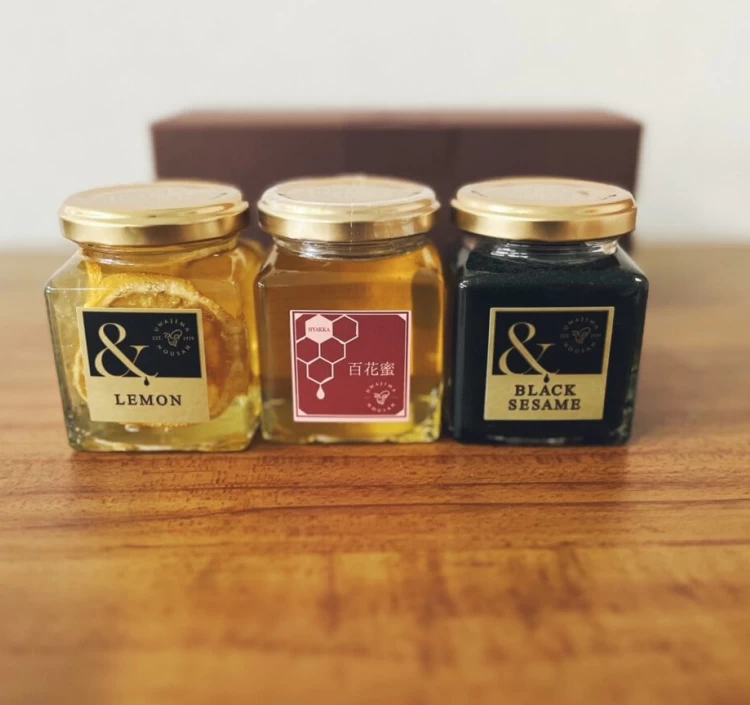 さまざまな種類の花の蜜から作られる百花蜜と、セミドライのレモンをアカシア蜜に漬け込んだ&LEMON、百花蜜に黒胡麻を漬け込んだ&BLACK SESAMEの3種類セット。