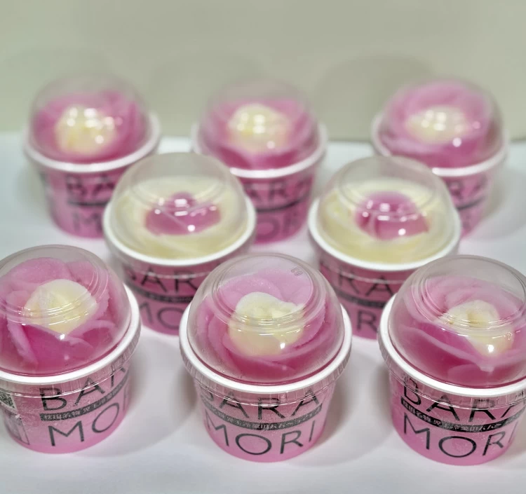 バラ盛りは、ピンク(イチゴ味)、黄色(バナナ味)でひとつひとつ手作。