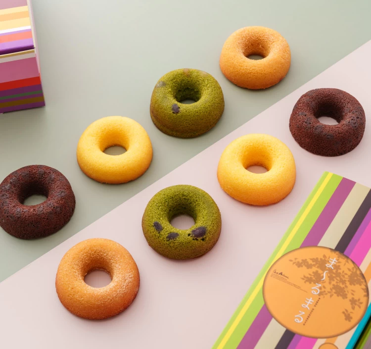 オーブンで、ふっくら、しっとり焼き上げた焼きドーナツです。和風テイストで、日本茶にも相性ばっちり!北海道産バターとひきたてのアーモンドプードルを使用した「プレーン」・スペイン産のチョコレートでお作りしたチョコチップが入った「チョコレート」・5種類のかのこ豆と京都宇治産の抹茶を使用した「抹茶」・徳島の高級和三盆糖を使用した「和三盆」・岡山県産の黒洲きなこを生地に練りこんだ「きなこ」の5種類のお味でお届けいたします。また栗、パイン、さくらなど季節によってメニューも追加されますので、ぜひお試しください。