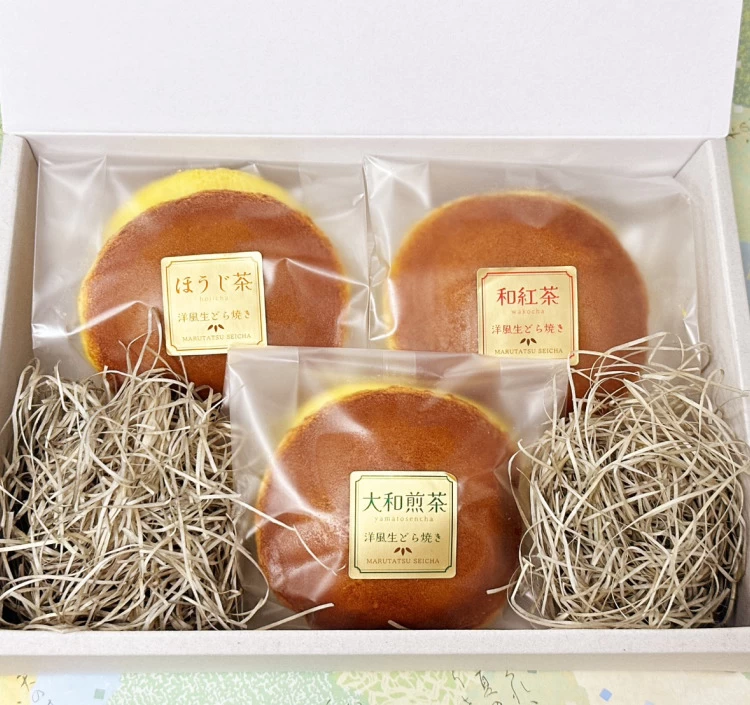 奈良県産のほうじ茶を使用したほうじ茶どら焼きと、奈良県産の和紅茶を使用した和紅茶どら焼き、奈良県産の大和茶を使用した大和煎茶の洋風どら焼きのセット。一般的などら焼きとは違った洋風の生どら焼きは、コーヒーや紅茶にもぴったりです。