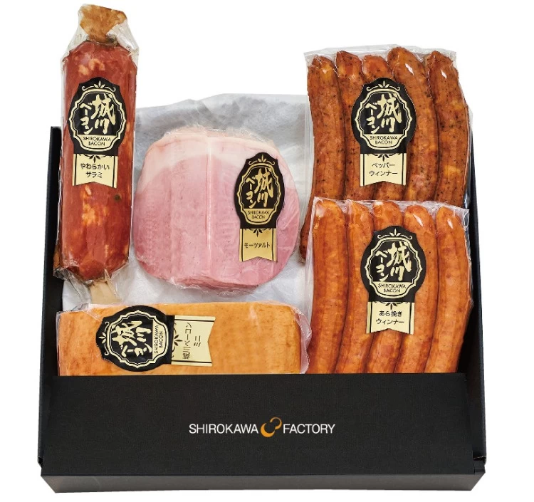 | 内容量 | ・城川ベーコンミニ(180g)・あら挽きウインナー(5本入り)・モーツァルトミニ(200g)・ペッパーウィンナー(5本入り)・やわらかいサラミ(120g) |