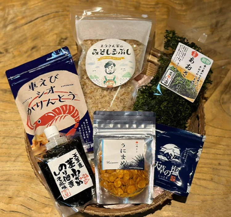 人気上昇中の車えびシオかりんとうや温かいお汁ものに欠かせない天草のあおさ、天草は日本一の生産を誇る雑節などを詰め合わせました。