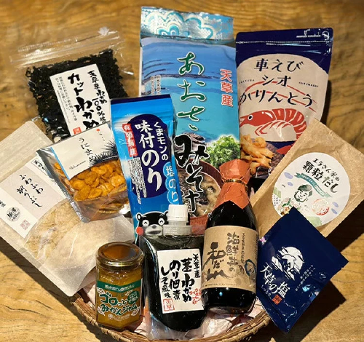 人気上昇中の車えびシオかりんとうや温かいお汁ものに欠かせない天草のあおさ、天草は日本一の生産を誇る雑節を極薄でふわふわに仕上げた節などなど、天草の海の幸、山の幸を贅沢に詰め合わせました。