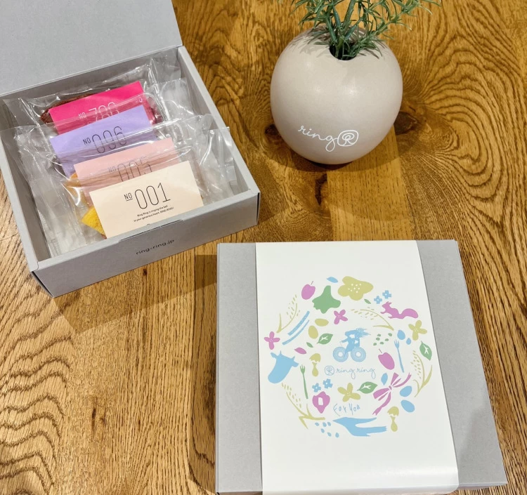 札幌市で米粉100%・グルテンフリーのバウムクーヘンを製造・販売する「ring ring」の米粉100%のバームクーヘン。お店で人気のプレーンと甘酸っぱいリンゴ味、季節限定バウム、香ばしい黒うるち米のカットバームをセット。しっとり食感とビート糖のまろやかな甘さで心がほっこりします。