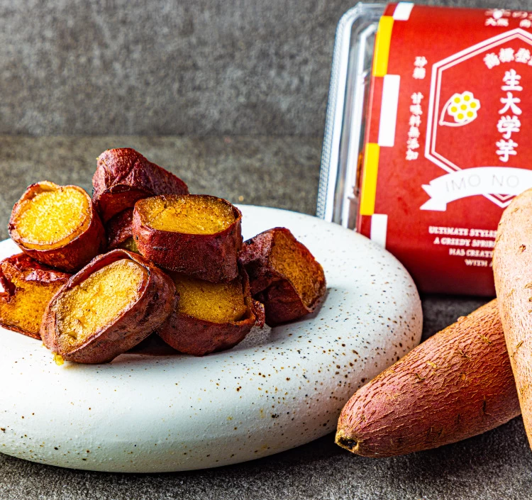 大阪のおいもスイーツカフェのオリジナルで商標登録もしている「生大学芋」。茨城県産の最高級紅はるかを独自の製法で焼きいもにしてから、米油で揚げました。皮はカリカリ、おいもはねっとりとして、甘味がじゅわっと溢れ出します。