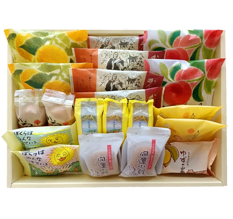 | 内容量 | 土佐の果樹園(すもも):2個 土佐の果樹園(小夏):2個 かんざし:5個 人のよろしさ:3個 小夏サンド:3個 いごっそう:2個 開運小判:2個 |