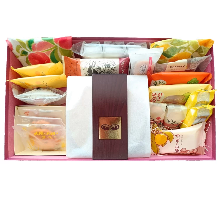 浜幸定番の創作お菓子である、かんざし、土佐の果樹園、人のよろしさ、南風小夏サンドなどの他、ポピュラーなマドレーヌやバウムクーヘンなどの洋菓子を詰合せました。