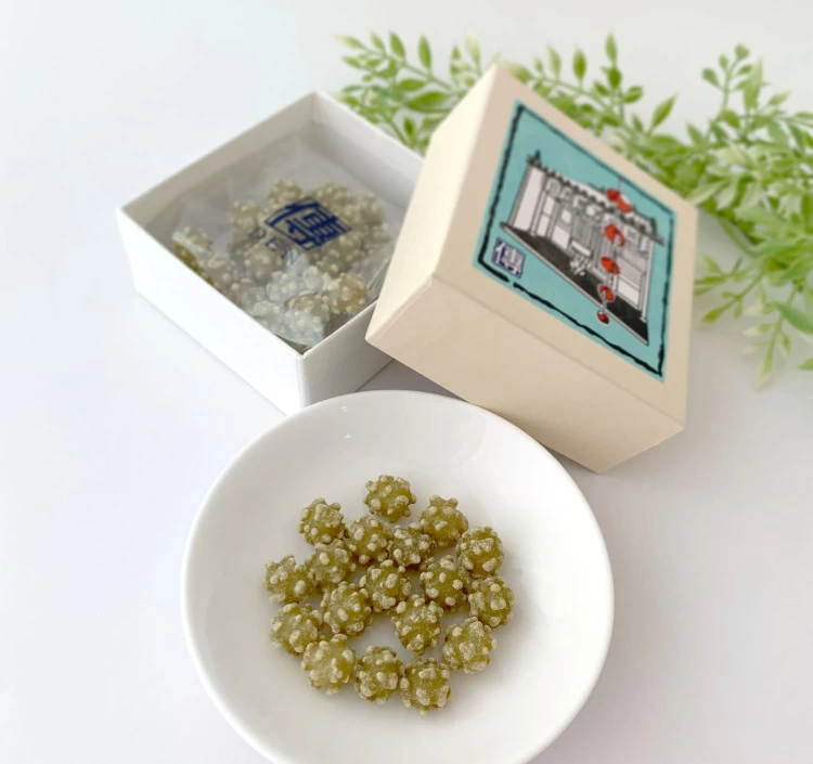 吉野産の柿の葉を原料として使用している奈良ならではの金平糖。くどさのないやわらかな甘さが魅力で、柿の葉寿司でお馴染みの柿の葉の香りが楽しめる一品です。